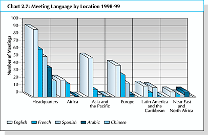 54. The pattern of meeting languages at Headquarters and by region is shown in Chart 2.7. English is the predominant language used in meetings held at Headquarters as well as in Asia and the Pacific and Europe. In Africa, French and English are nearly equally used. In Latin America and the Caribbean, the main languages are Spanish and English. In the Near East and North Africa, they are Arabic and English. When meetings are held in a single language, it tends to be English; this was the case in 94 of the 100 monolingual meetings held in 1998-99. English is generally included when other languages are used; only one multilingual meeting was held in 1998-99 that did not include English.