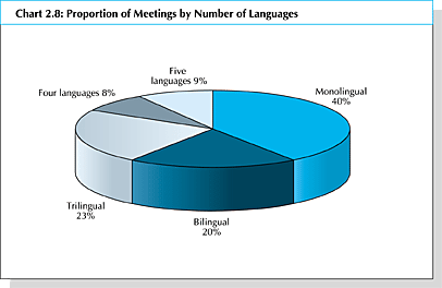 55. The proportion of meetings using a number of languages is shown in Chart 2.8. While five-language meetings represented only 9 percent of the meetings, interpretation provided for them constituted 52 percent of the interpretation workload, measured in interpreter days. Four-language meetings represented 8 percent of meetings and 18 percent of interpreter workload. Trilingual meetings accounted for 23 percent of meetings and 18 percent of interpreter workload and bilingual meetings 20 percent of meetings and 12 percent of interpreter workload. On average, five-language meetings required some 24 interpreters, four-language meetings 12 interpreters and three- and two-language meetings 5 and 3 interpreters respectively. Generally speaking, each additional language doubles the number of interpreters required for the meeting.