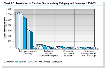 56. Chart 2.9 shows the translation of meeting documentation by language, measured in thousands of words. Inter-governmental meetings (Category 1) accounted for over 92 percent of the meeting documentation translated and technical sessions attended by experts (Category 2) for about 6 percent. French and Spanish translations were each about a third of the total words translated, followed by Arabic with 18 percent and Chinese with 16 percent.