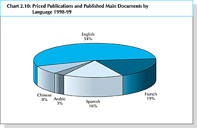 60. As shown in Chart 2.10, English accounted for more than half of all priced publications and main documents produced in 1998-99. French accounted for 17 percent, Spanish 15 percent and Arabic 5 percent. Chinese language documents accounted for 9 percent of the total and were published both at Headquarters and in China, through the Chinese Publishing Programme. This programme is carried out in cooperation with the Chinese Academy of Agricultural Sciences and has the advantage of the direct involvement of that country in the selection, publication and distribution of the documents to be translated.