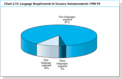 64. Language is related to the overall requirements of a post. For many posts above P2, a minimum of two languages is required. Chart 2.11 shows that over 85 percent of the vacant posts advertised in 1998-99 required two languages, with 3 percent requiring three languages. In addition, 80 percent of posts requiring one language had a second language as a desirable qualification. Language proficiency is emphasized at the time of recruitment; upon confirmation of appointment, newly-recruited staff may be required to undergo a proficiency examination in the relevant official language(s) - English, French, Spanish, Arabic or Chinese. For many current staff, language proficiency has become an important criterion for promotion.
