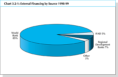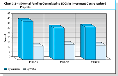 399. External funding committed to Least Developed Countries (LDCs) remained steady. A slight decrease from 16 percent in 1996-97 to 15 percent in 1998-99 was matched by a decrease in projects from 29 to 26; the number of projects remained about one-third of the total (Chart 3.2-4).