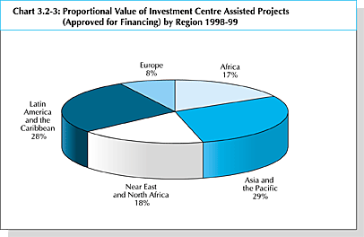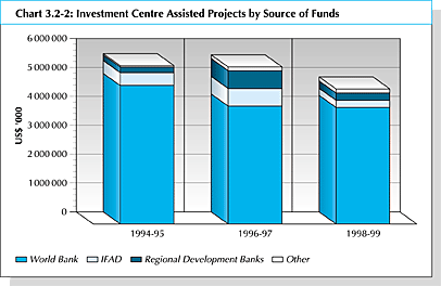 398. Distribution of external financing by region in 1998-99 compared to 1996-97 (Table 3.2.4) remained virtually unchanged in Africa (US$ 559 million, from US$ 530 million) and Europe (US$ 244 million, from US$ 278 million). There was an increase in external financing in the Near East and North Africa from US$ 137 million to US$ 568 million, with greater support to development projects in the Maghreb countries. External funds committed to Asia and the Pacific declined from US$ 1,115 million to US$ 941 million, reflected in a drop in approved projects. Those committed to Latin America and the Caribbean declined from US$ 1,416 million to US$ 899 million. Value of investment by region is shown in Chart 3.2-3.