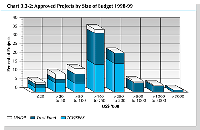403. About 65 percent of the projects approved and operational in 1998-99 had budgets of less than US$ 250 000, more than half of these being between US$ 100 000 and US$ 250 000, as shown in Chart 3.3-2. The decline in large projects continued with only 5 percent of approved projects having budgets above US$ 1 million compared to 10 percent in 1996-97 and more than 25 percent in the past. TCP and SPFS accounted for 46 percent of the new projects approved, followed by Trust Funds at 44 percent and UNDP at 10 percent. For UNDP this was a decline from 15 percent in 1996-97. The 1998-99 biennium was the first time that new TCP and SPFS projects exceeded the number of new Trust Fund projects.