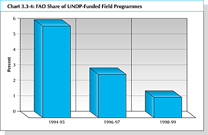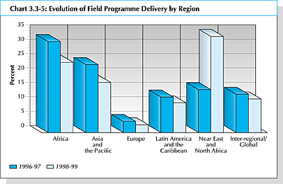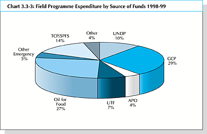 404. Field programme delivery in 1998-99 increased by about 12 percent to US$ 555.2 million (Table 3.3-1). As noted earlier this was due to increases in emergency and special relief operations, primarily the Iraq Oil for Food programme, which increased more than five-fold, from US$ 28.1 million in 1996-97 to US$ 147.8 million in 1998-99. Other special relief operations increased by 21 percent. Expenditures in most other areas of the field programme declined: UNDP by 38 percent, FAO/Government Cooperative Programme by 9 percent, Associate Professional Officers programme by 26 percent, Unilateral Trust Funds by 13 percent and TCP and SPFS by 5 percent.