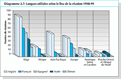 54. Les langues utilisées selon le lieu de réunion (siège ou régions) sont indiquées dans le diagramme 2.7. L'anglais est la langue prédominante pour les réunions tenues au siège, ainsi que dans la région Asie-Pacifique et en Europe. En Afrique, le français et l'anglais sont utilisés pratiquement à égalité. En Amérique latine et dans les Caraïbes, les principales langues sont l'espagnol et l'anglais. Au Proche-Orient et en Afrique du Nord, ce sont l'arabe et l'anglais. Lorsque les réunions se tiennent en une seule langue, c'est en général en anglais; ainsi, sur 100 réunions unilingues, 94 se sont tenues en anglais pendant l'exercice 1998-99. L'anglais figure presque toujours parmi les langues utilisées; en 1998-99, une seule réunion multilingue s'est tenue sans l'anglais.