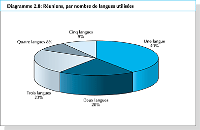 55. Le diagramme 2.8 indique le pourcentage de réunions, selon le nombre de langues utilisées. Si les réunions se tenant en cinq langues ne représentent que 9 pour cent du nombre total de réunions, les services d'interprétation fournis pour ces réunions ont représenté 52 pour cent de la charge de travail mesurée en jours/interprète. Les réunions tenues en quatre langues ont représenté 8 pour cent des réunions et 18 pour cent de la charge de travail. Les réunions tenues en trois langues ont représenté 23 pour cent des réunions et 18 pour cent de la charge de travail et les réunions bilingues 20 pour cent du nombre total de réunions et 12 pour cent de la charge de travail. En moyenne, les réunions tenues en cinq langues ont nécessité 24 interprètes, celles tenues en quatre langues 12 interprètes et celles tenues en trois ou deux langues 5 et 3 interprètes, respectivement. En règle générale, chaque langue supplémentaire double le nombre d'interprètes nécessaires pour la réunion.
