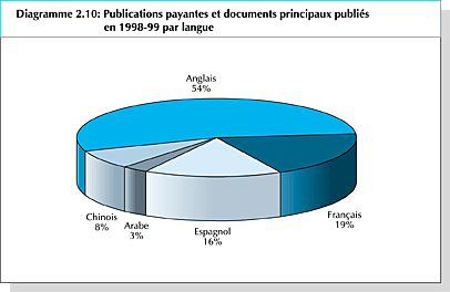 60. Comme l'indique le diagramme 2.10, plus de la moitié des publications payantes et des documents principaux parus en 1998-99 étaient rédigés en anglais. Les publications en français ont représenté 17 pour cent du total, celles en espagnol 15 pour cent et celles en arabe 5 pour cent. Les titres en chinois publiés tant au siège de la FAO qu'en Chine, dans le cadre du programme de publications en chinois, ont représenté 9 pour cent du total. Le programme de publications en chinois est exécuté en coopération avec l'Académie chinoise des sciences agricoles et a l'avantage de permettre à ce pays de participer directement au choix, à la publication et à la distribution des documents à traduire.