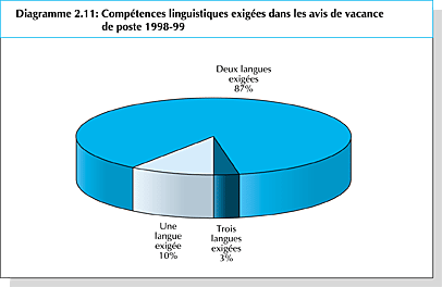 64. La connaissance des langues fait partie des qualifications exigées des candidats à un poste à la FAO. Pour la plupart des emplois de classe supérieure à P2, un minimum de deux langues est indispensable. Le diagramme 2.11 montre que plus de 85 pour cent des avis de vacance de poste publiés en 1998-99 exigeaient la connaissance de deux langues et 3 pour cent celle de trois langues. En outre, 80 pour cent des avis exigeant la connaissance d'une langue indiquaient la connaissance d'une seconde langue comme qualification souhaitable. L'Organisation met traditionnellement l'accent sur les compétences linguistiques au moment du recrutement; elle se réserve le droit de soumettre les fonctionnaires nouvellement recrutés à un test d'aptitude linguistique dans les langues officielles pertinentes, à savoir - l'anglais, l'arabe, le chinois, l'espagnol ou le français. Pour de nombreux fonctionnaires en poste, les compétences linguistiques sont désormais un critère important de promotion.