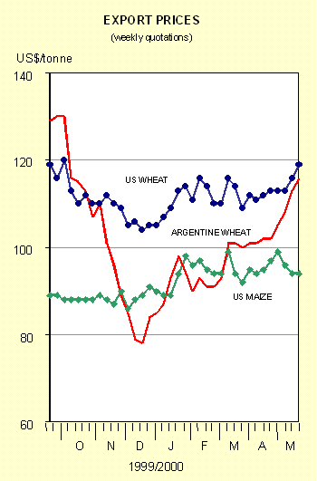 At this time of the year, the international maize market is usually trading largely on the weather situation and the size and condition of the new crop in the United States, which also explains the more volatile nature of price developments since mid-April. Earlier in May, the U.S. maize prices rose sharply but lost most of their momentum later in the month. Overall, however, the U.S. No. 2 maize (fob) averaged US$95 per tonne in May, unchanged from March but US$2 per tonne above the corresponding period last year. The CBOT maize futures also continued to remain above last year's values despite some weaknesses later in the month, mostly in response to reports of record planting pace in the United States. In the near-term, however, the outlook for maize prices is rather uncertain, much depending on the eventual size of exportable supplies in China along with demand prospects in several major Asian markets in the aftermath of the recent outbreak of the foot-and-mouth disease.