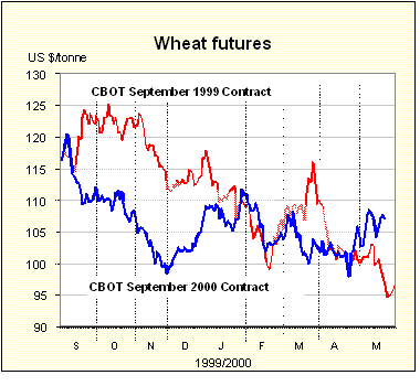 International wheat prices in May edged slightly higher as the overall bearish sentiment which characterized the price developments in earlier months gave way to some upside movements, mainly in response to less favourable crop weather conditions in the United States. In May, the U.S. wheat No. 2 (HRW, fob) averaged around US$116 per tonne, up US$4 per tonne from March and also US$4 per tonne more than in the corresponding period in the previous year. Similarly, wheat futures have also strengthened in recent weeks. By late May, the September wheat futures for soft red winter at the Chicago Board of Trade (CBOT) were quoted at US$107 per tonne, up US$12 per tonne from the previous year.