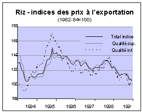 Les cours mondiaux du café ont continué à baisser au cours de la campagne agricole 1998/1999 (octobre-septembre) du fait de l'affaiblissement de la demande dans plusieurs pays consommateurs et de l'accroissement des disponibilités exportables au Brésil. Les prix mondiaux ont augmenté légèrement en mai en prévision d'une récolte réduite au Brésil. Toutefois cette reprise a été de courte durée, avec le retour à des conditions météorologiques normales pour la saison, et dans l'ensemble une tendance à la baisse s'est imposée pour le reste de la campagne. Le fléchissement des prix a été encore exacerbé début 1999, par une dévaluation de 40 pour cent du real brésilien par rapport au dollar E.-U., ce qui a encouragé des exportations plus compétitives sur le marché mondial.