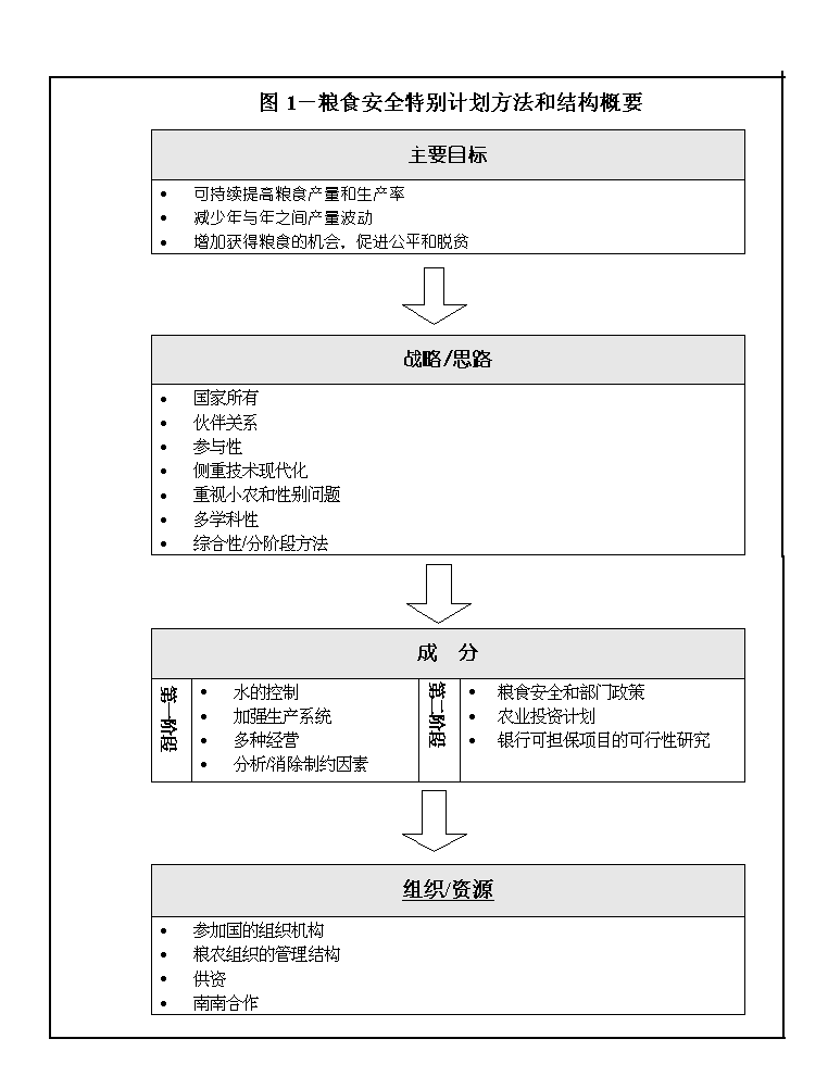 - 《粮食安全特别计划》在1994年粮农组织理事会一致通过之后发起,并在1996年11月得到世界粮食首脑会议的赞同。在世界粮食首脑会议上,国家元首和政府首脑承诺将粮食安全作为其国家发展努力(受益国)或其发展支持政策(捐助国)的重点活动。首脑会议还同意七项基本承诺,旨在到2015年使世界营养不足人数减半。《粮食安全特别计划》的主要目标是帮助低收入缺粮国在可持续的基础上迅速提高粮食产量和生产率,减少年与年之间的产量波动,增加获得粮食的机会以作为对公平和脱贫的一个贡献(下面图1)。因此,该计划预期对落实世界粮食首脑会议行动计划的基本承诺,特别是下面三项承诺作出重大贡献: