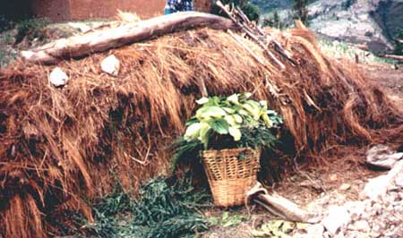 Lámina 36. Paja de arroz almacenada cerca de la casa; las hojas de los árboles son un forraje verde suplementario. Nepal