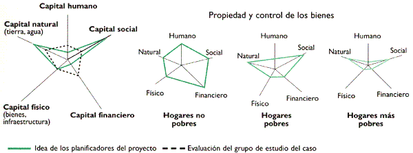 CUESTIONES DEL PENTÁGONO DE BIENES - GRUPO DE ESTUDIO DEL CASO DE MALÍEl pentágono de bienes del enfoque de MSS tiene cinco dimensiones: capital natural, físico, financiero, humano y social. Al tratar de aplicar el pentágono, el grupo de estudio del caso de Malí descubrió que la percepción de los planificadores del proyecto difería de la del grupo de estudio del caso y se necesitaban tres pentágonos: uno para cada estrato socioeconómico. Además, resultaba difícil combinar varias dimensiones de un tipo de capital sobre el mismo eje. La infraestructura física regional y comunitaria no encajaba fácilmente en el mismo eje con los bienes del hogar. ¿Cómo valoramos el capital natural en un eje único cuando la tierra es abundante pero de mala calidad? ¿Cómo valoramos el capital humano cuando la salud y alfabetización son bajas pero el suministro de mano de obra es abundante? Cuando calificamos el capital social como alto, medio o bajo, ¿cuál ha de ser el patrón de comparación (regiones dentro del país, el mundo)?