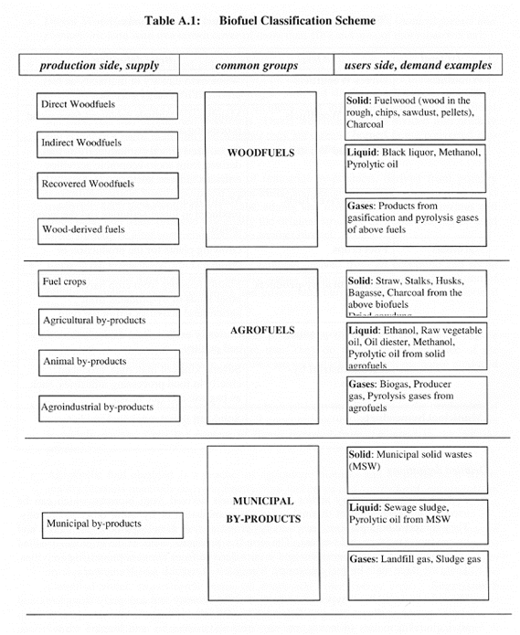 Table A.1 lists a biofuel classification, which