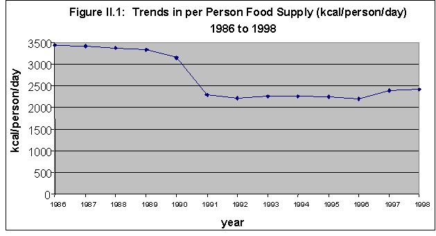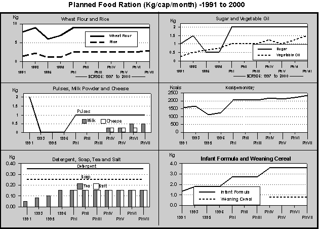 The existing food rations do not provide a nutritionally adequate and varied diet. Although since their effective implementation in 1997 they have halted further deterioration in the nutritional situation, they have not by themselves been able to reverse this trend. In spite of the fact that the ration is reasonably adequate in energy and total protein, it is lacking in vegetables, fruit, and animal products and is therefore deficient in micronutrients. With only one quarter of the planned ration of pulses distributed due to gaps in the submission of applications for procurement, the protein quality of the diet has also been poor.