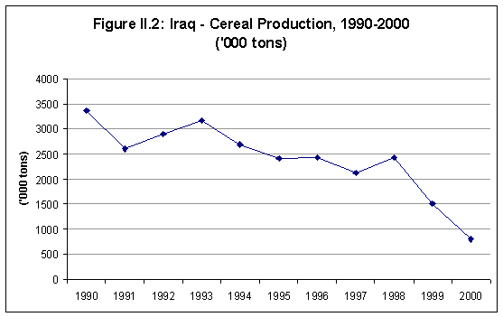 Two consecutive years of severe drought and inadequate supply of essential agricultural equipment and inputs, including spare parts, fertilizers, pesticides and herbicides, have gravely affected the Iraqi agriculture sector. Reflecting a substantial reduction in plantings and yields, cereal production in 2000 is estimated by the Mission at a record low volume of 794,000 tons, some 47 percent down over last year's poor harvest and 64 percent below the previous five years average.
