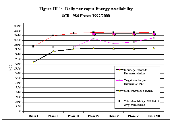 The Oil-for-Food Programme was adopted as a measure to arrest the deterioration of the humanitarian situation in Iraq, in particular to reverse the trend with regards to nutrition and health. The energy and protein content of the food ration increased steadily since 1997 and since 1998 have provided a national average of 2,000 kcal and 43 g of protein per person/day. This improvement in national food availability and the high level of UN and NGO activity in the autonomous north arrested further nutrition decline. However this is still below the 2,463 kcal recommended by the Secretary-General, below that of 2,210 kcal recommended by WHO for emergency energy requirements and short of the planned level of 2,330 kcal which is calculated based on forecasts of food imports and availability of in-country food stocks. Improvements are needed to fully meet planned levels. Supplementation of the ration through the consumption of local produce, especially to improve dietary quality, has been further compromised by the drought.