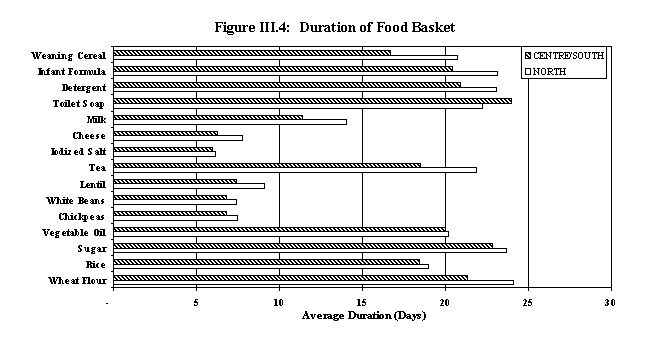 Other suggestions for providing support to the industry and increasing its markets would include local purchase of processed foods under SCR 986 that could be used in child feeding programs or for enhancing the ration. Costs could be appreciably below the price of imported products and this would increase employment opportunities and generate increased income. Such foods would of necessity be required to meet all appropriate quality and safety standards for which the above-mentioned rehabilitation of the food industry is indispensable. These factors have had more of a negative impact in the centre/south than in the north with the beneficial effects of increased family rations being offset by the combination of these adverse conditions.