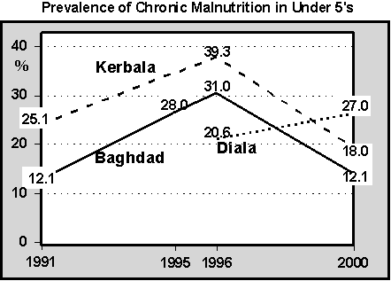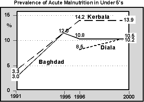 Although it is difficult to assess the impact of the drought over the past two years on nutrition, evidence suggests that malnutrition is highest outside Baghdad and in rural areas, possibly reflecting the effects of the drought. Rates of malnutrition appear to be associated with poverty and access to services. In school-age children, rates of malnutrition appear generally higher amongst boys as compared with girls. One possible explanation for this is the higher energy demands on adolescent males than females as a result of their greater involvement in the labour force.