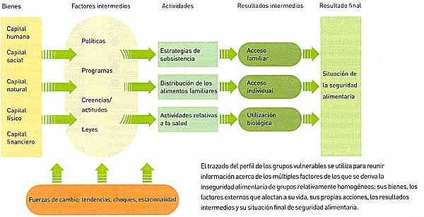 Aun en los casos en que un país dispone de lo suficiente para alimentar bien a su población, habrá dentro de él grupos vulnerables a la inseguridad alimentaria. Dentro de las comunidades, unas familias corren mayores riesgos de malnutrición que otras y, dentro de las familias, el riesgo es mayor para algunos miembros que para otros. Los niños pequeños y las mujeres embarazadas y lactantes son los grupos más vulnerables, pero la subnutrición afecta a todos los estratos de la sociedad: esto significa que un niño en edad escolar podrá no sacar todo provecho de la educación, un trabajador será menos productivo y una joven tendrá peligro de abortar.