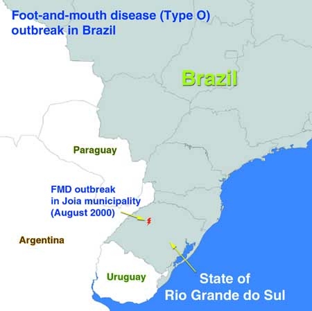 While Brazil was progressing towards FMD-free status in the state of Rio Grande do Sul, where the vaccination was stopped in May 2000 (see Box below), an outbreak occurred in August 2000. The disease was first reported in Joia municipality (State of Rio Grande do Sul) on 23 August 2000.
