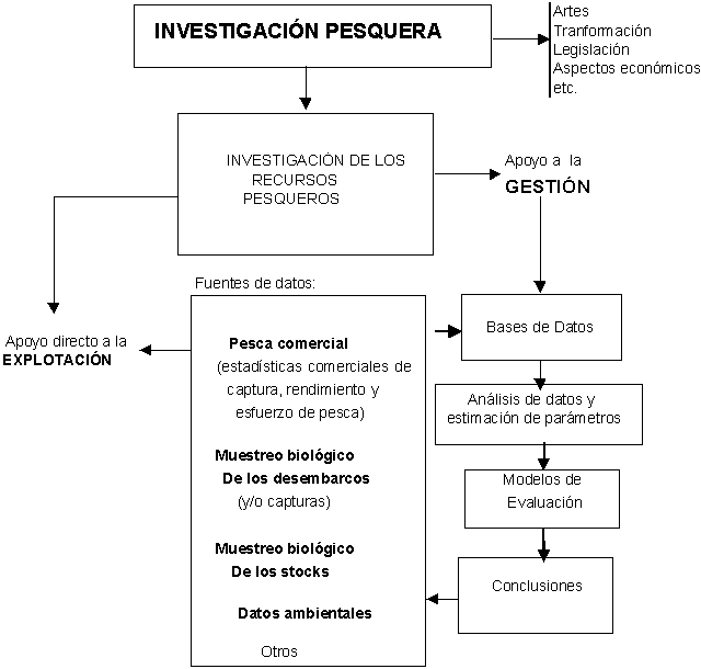 El esquema (Figura 1.1) muestra que la investigación pesquera contempla varios sectores de la actividad pesquera. Este curso se ocupa fundamentalmente de los modelos de evaluación destinados a apoyar la gestión pesquera. De los varios trabajos sobre evaluación de los recursos pesqueros los libros y/o manuales de Beverton y Holt (1956), Ricker (1958, 1975) y Gulland (1964, 1983) constituyen referencias históricas obligadas.