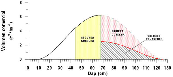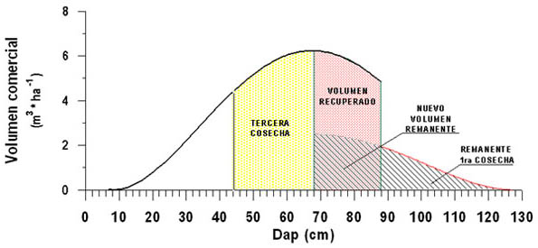 Asumiendo que la curva de volumen comercial en función del diámetro es una aproximación valida de una tabla de vida instantánea del bosque, es posible obtener una aproximación del volumen recuperado al final de un turno dado, luego de un aprovechamiento del 60% de los individuos arriba de cierto DMC. Este cálculo se realiza mediante la integración de una sección de la curva de volumen cuyo límite inferior está definido por el DMC y el límite superior por el diámetro alcanzado por el DMC al final del turno (Figura 1).
