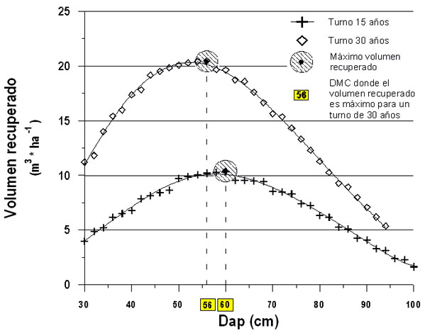 De este modo para cualquier turno dado existirá un DMC óptimo cuyo volumen recuperado al final del turno es el máximo. En la Figura 2 se muestra una gráfica de volumen recuperado en función del DMC establecido en la cosecha en la cual es posible interpolar el DMC donde el volumen recuperado es máximo evaluado para dos turnos: 15 y 30 años.