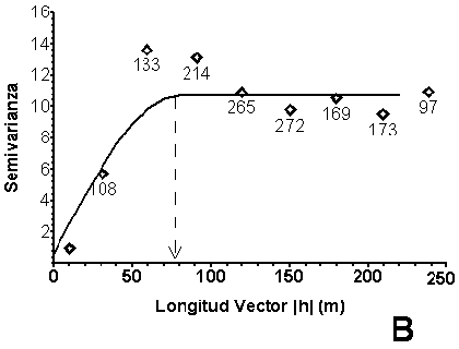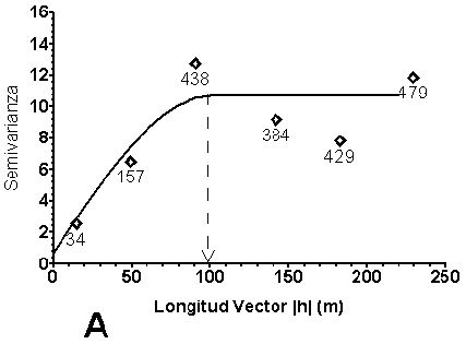 Utilizando VARIOWIN 2.2 demo version7, programa especialmente diseñado para este propósito, se calcula la semivarianza anisotrópica en las direcciones 0° y 90°, con un lag de 46 m, para luego graficar los datos con respecto a la distancia entre puntos. Una vez graficada la información (Figura 7), se busca el modelo de semivariograma de mejor ajuste obteniéndose la Ecuación 3, en la cual se representa un semivariograma esférico de variación anisotrópica (a = 0.74), con un efecto nugget de 0.6997 m2, un rango de 102.3893 m y un sill de 10 m2 (Sección 7.1.1).