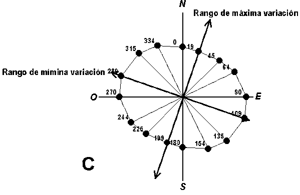 Por lo tanto, en este ejemplo en particular la mínima variación se encontrará entonces en dirección 109° (Figura 7); y dado que el rango es de aproximadamente 100 m, la separación óptima entre carriles sería la mitad, o sea, 50 m.