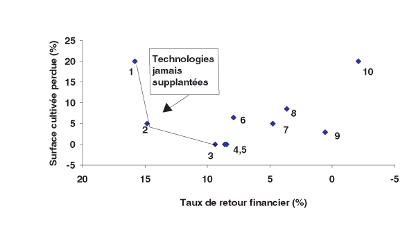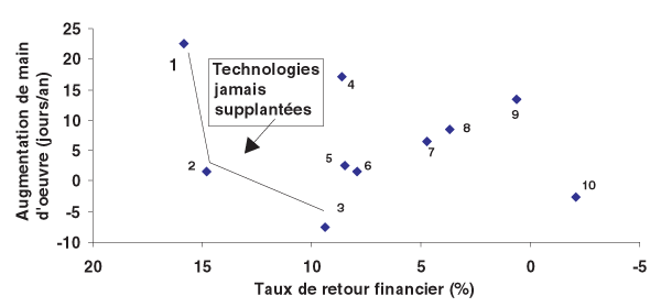 Les figures 6 et 7 et le tableau 13 présentent des applications simples des AMC pour la gestion des sols en Afrique de l'Ouest. L'analyse qualitative dans le tableau 13 applique quatre critères représentant différents objectifs des petits exploitants, dont l'un est la rentabilité financière. Cette technique simple tient compte d'une évaluation beaucoup plus large, mettant en valeur des imperfections ou des avantages des différentes technologies qui peuvent ne pas être évidents dans une analyse purement financière. Les figures 6 et 7 présentent une technique quantitative plus sophistiquée d'AMC, pour évaluer certaines des technologies citées dans le tableau 13. Elles emploient l'approche « courbe de compensation » pour évaluer les compensations entre la rentabilité financière et un autre critère. Cette technique permet à l'analyste d'éliminer les choix dominés ou inférieurs (Meier et Munasinghe, 1994). Sur les figures 6 et 7, seules trois technologies ne sont dominées par aucune autre dans chaque exemple. Des exemples plus sophistiqués d'AMC et de gestion du sol incluent une approche mixte quantitative/qualitative appliquée à un projet de contrôle des sédiments au Maroc. Dans cet exemple, la protection du bassin versant est bien plus onéreuse que les travaux de dragage ou d'hydraulique dans les réservoirs mais a un bien meilleur score sur des critères de durabilité et de justice (van Pelt, 1993).