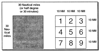 The names of the statistical rectangles, which here are the same as the code, are composed of a letter and a number (Figure 4.2.1). The statistical rectangles may be further subdivided into 9 divisions each of dimension 10×10 nm, with the numbering, 1,2…9, as indicated on the figure. The number “0” indicates the entire 30×30 nm. No real fishing ground fits exactly to the statistical rectangles, but for a number of practical reasons, it is advantageous for the fisheries data collector to adopt the standard system.