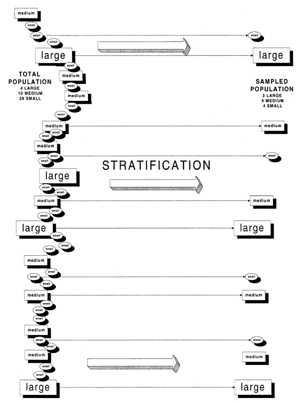 Figure 4.3.1 Illustration of the concepts of “strata” and “stratification” (for further explanation, see text). The left side represents a coast with three categories of landing site to be sampled, large medium and small.
