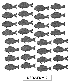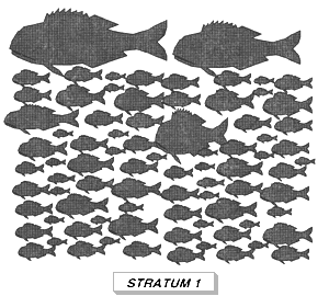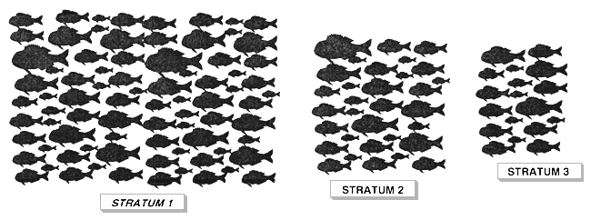 The second and third criteria are also used to define strata. Optimum strata minimise variation within them (i.e. maximise variation between strata), and make the most expensive strata as small and as homogeneous as possible. In the fish size example, the most obvious strata are the commercial groups. In other cases, it may not be so simple and some initial random sampling may be required to identify an appropriate stratification.