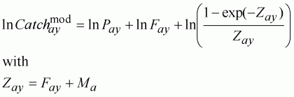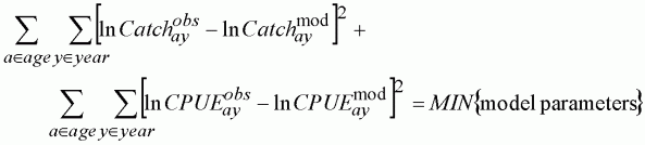 The weights that are required are the variances (s2) of the CPUE indices. These should be readily available from the surveys. In the formulation above these weights are expressed relative to the accuracy of the catch data, a problem that is often less tractable than the estimation of the variance from the surveys. This is because of the way the catch-at-age matrix is built from many different sources and in some cases there is no direct age-length key available for a portion of the total catch. In these cases one of the available ALKs is used which is thought to best represent that catch, but it is difficult to assess the variance and bias that such a procedure may produce in the catch-at-age matrix. In practice, the problem is unresolved and the CPUE indices (or other stock indicators) are given equal weight, while the catches are assumed to be estimated with far less variance than the surveys and hence this contribution is given infinite weight, i.e. the catch equation is fitted exactly.