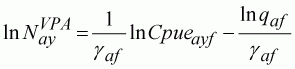 The problem can be reduced by assuming that the noise in the catch data is much less than the errors in the CPUE data and therefore the catch term in the sum of squares can be fulfilled exactly. This means that all fishing mortalities and all population sizes can be written as a function of the fishing mortality in the terminal year for all age groups and of the terminal age for all years. This reduces the parameters to the log catchabilities and the terminal log fishing mortality (or equivalently the terminal log population of survivors). A further reduction is to note that the least-squares estimator for the log catchabilities can be found explicitly as: