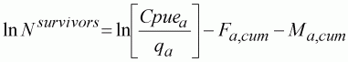 The XSA iteration starts with an initial guess of the number of survivors (population at the end of the year of the oldest age group included in the analysis) and M. The XSA then applies a standard VPA to the catch-at-age and year data to provide stock sizes N. Based on these stock sizes the catchability q and the exponent g can be estimated by linear regression (Equation 67):