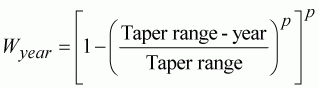 The taper range in the Lowestoft package is set at a default value of 20 years, so only the last 20 years catch or CPUE are included in fitting the model. The default taper is a tricubic type (p=3). The introduction of such a time taper modifies the object function to: