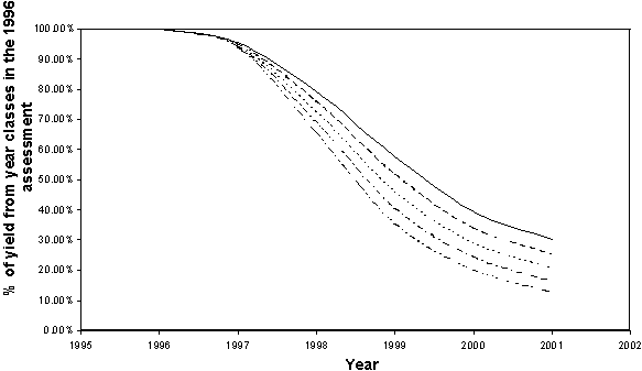Figure 9.1 Percent of projected yield (Baltic cod ICES subdivisions 25-32) from year classes estimated in the 1996 assessment for 5 exploitation levels. As the projection is extrapolated into the future, the dependence of yield on the current assessment falls.
