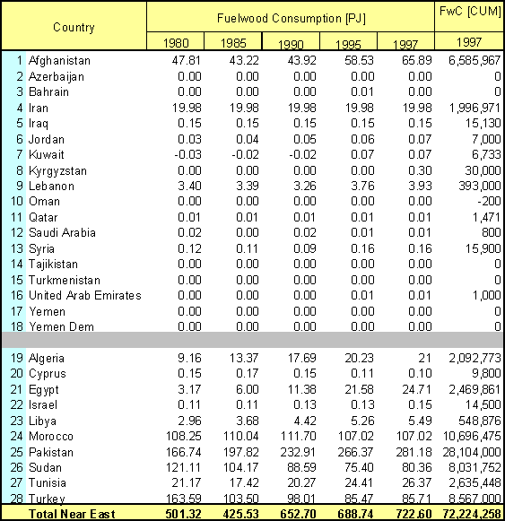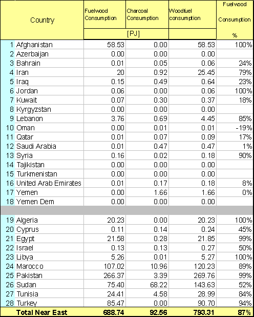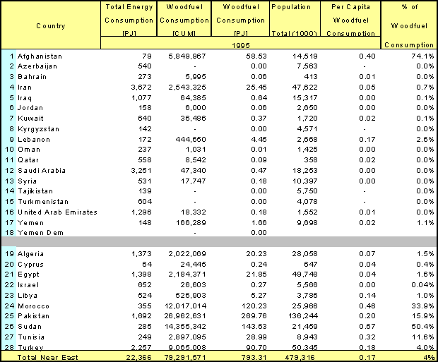 As shown in Annex 3, the total woodfuel consumption in the Near East countries amounts to 793.31 PJ in 1995. This account for merely 4% of the total energy at 22,366 PJ consumed in the region in 1995.
