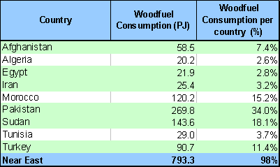 The major Woodfuel producer and consumer in the Near East region is Pakistan, at 34.6 % and is thereby the most important woodfuel consumer in proportion to the total woodfuel consumption. Sudan (18.1%) follows Pakistan. Morocco (15.2%), Turkey (11.4%), Afghanistan (7.4%), Tunisia (3.7%), Iran (3.2%), Egypt (2.8%) and Algeria (2.6%), as shown in table 2.2. These countries consume 98% of all the woodfuel in the region, although they comprise only of 10 countries. The remaining countries consume merely 2%, which is equal to 13.91 PJ. The total consumption of woodfuel in the Near East adds up to 793.3 PJ.