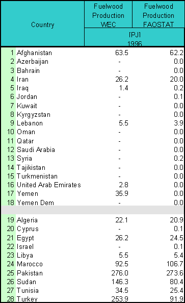Table 2.3.3. WEC and FAOSTAT fuelwood production1996