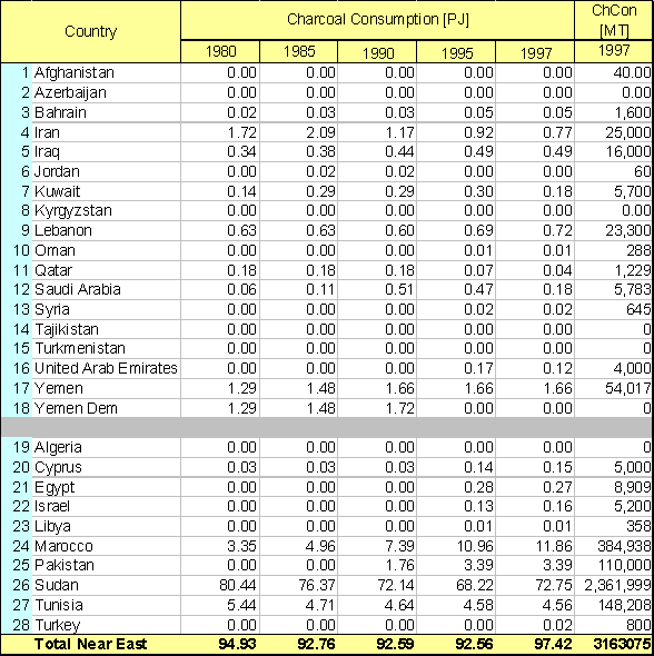 The information available shows that the charcoal consumption in Near East countries is nearly non-existent and there is no data at all available for the former Soviet republics, i.e. Azerbaijan, Kyrgyzstan, Tajikistan and Turkmenistan.