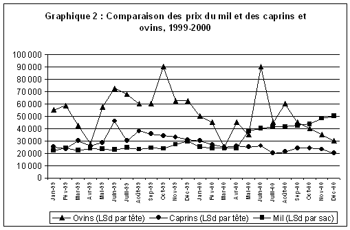 Les bas prix des céréales de 1999, qui avaient eu une incidence négative sur la production, ont commencé à remonter progressivement en février pour atteindre leur sommet en septembre et octobre. Ces prix élevés ont constitué une incitation à l'augmentation des semis. Par exemple, les prix au détail de 30 000 à 40 000 LSd le sac de 90 kg de sorgho relevés au début de la campagne agricole 2000/01 (c'est à dire de mai à juillet 2000) étaient bien au-dessus des 19 000-20 000 LSd considérés comme le prix minimal rémunérateur pour le secteur pluvial à ce moment-là.