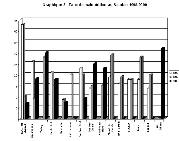 Des enquêtes nutritionnelles ont été menées cette année dans 15 des 226 points de distribution du PAM au Soudan. En 2000, les taux de malnutrition ont varié d'une région à l'autre et à l'intérieur des régions. Dans les zones où l'insécurité et le manque d'accès ont sensiblement limité la livraison des approvisionnements de secours, comme par exemple dans certaines parties de Bahr el Ghazal, d'Union et de Kassala (Hamashokreib), la malnutrition est en général élevée, allant de 15 à 45 pour cent. Mais dans les régions plus accessibles, l'aide alimentaire a aidé à faire tomber les taux de malnutrition à moins de 10 pour cent, comme on peut le voir dans les camps de personnes déplacées à l'intérieur du pays situés dans les villes de garnison. Les zones de transition de Darfour Sud, de Khartoum et de Kordofan abritent des personnes déplacées depuis longtemps dont l'état nutritionnel est lié au manque de services de base. Les maladies sont une autre cause majeure de malnutrition dans ces régions: elle y avoisine les 20 pour cent. Dans les États sahéliens des États de la mer Rouge et du Soudan septentrional où existe un état chronique d'insécurité alimentaire, le taux de malnutrition est régulièrement supérieur à 23 pour cent et en augmentation.