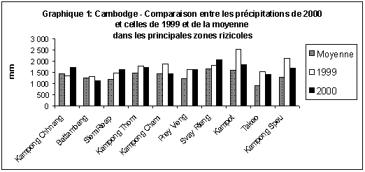 La plupart des familles d'agriculteurs produisent du riz. Les principales zones rizicoles sont les provinces de Battambang, Banteay Meanchay et Siem Reap dans le Nord-Ouest, et Kmpong Cham, Takeo et Prey Veng dans le Sud-Est. Dans les années normales, l'ensemble de ces provinces produit 63 pour cent environ de la production totale. La plupart des cultures de riz sont des cultures de saison des pluies, qui vont de juillet à octobre. Elles dépendent entièrement des précipitations et représentent 85 pour cent de la production agricole annuelle, plus de quatre-ving dix pour cent des superficies récoltées et près de 70 pour cent des apports énergétiques du régime alimentaire. Cinq différents systèmes de riziculture sont pratiqués au Cambodge, dont trois durant la saison des pluies et deux durant la saison sèche: