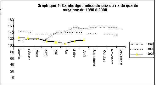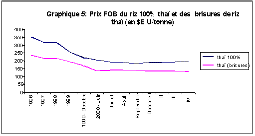 Le graphique 4 présente l'indice du prix du riz sur le marché cambodgien et le graphique 5 indique l'évolution des prix fob du riz thaï au cours des trois dernières années jusqu'au mois d'octobre dernier.