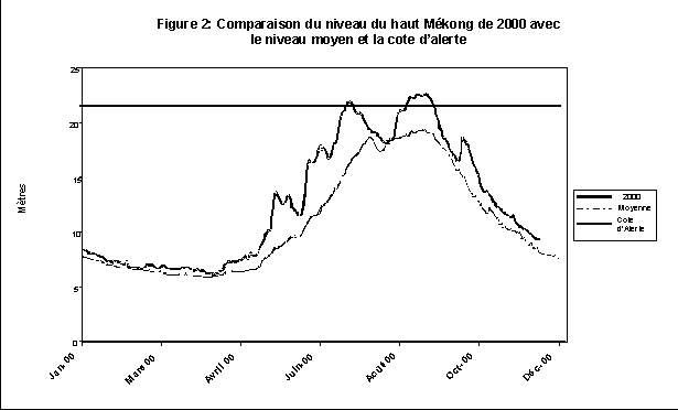 Les inondations se sont produites d'abord en juillet puis se sont répétées avec plus de violence et sur une plus grande superficie en septembre quand les eaux du Mékong ont atteint des niveaux supérieurs à la normale en certains endroits stratégiques et ont dépassé la cote d'alerte. La figure 2 présente l'évolution du niveau des eaux du haut Mékong par rapport à la moyenne et à la cote d'alerte.
